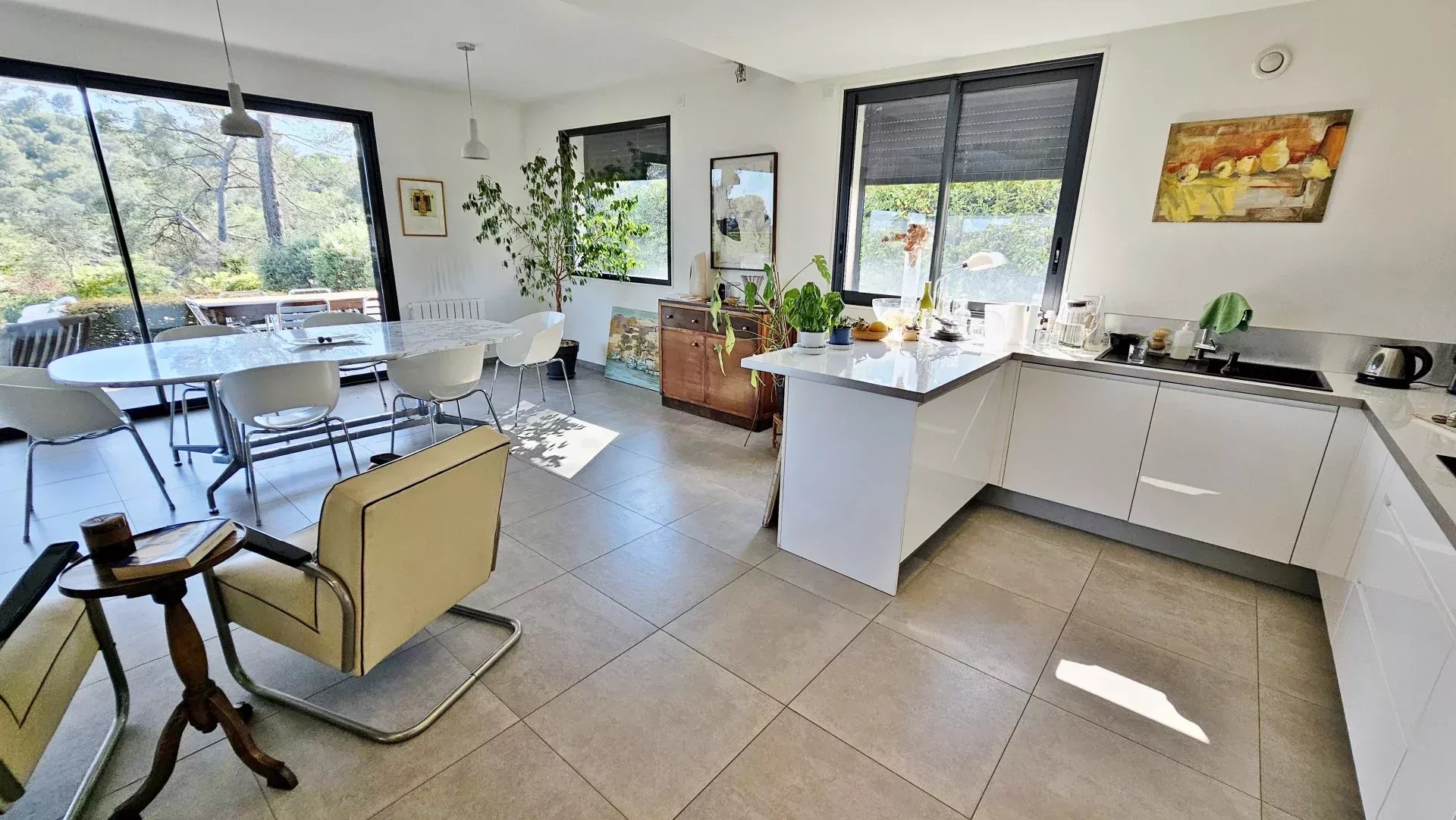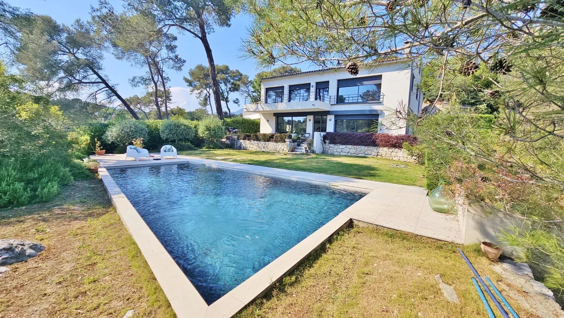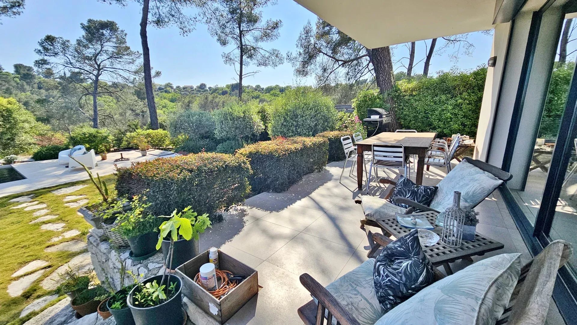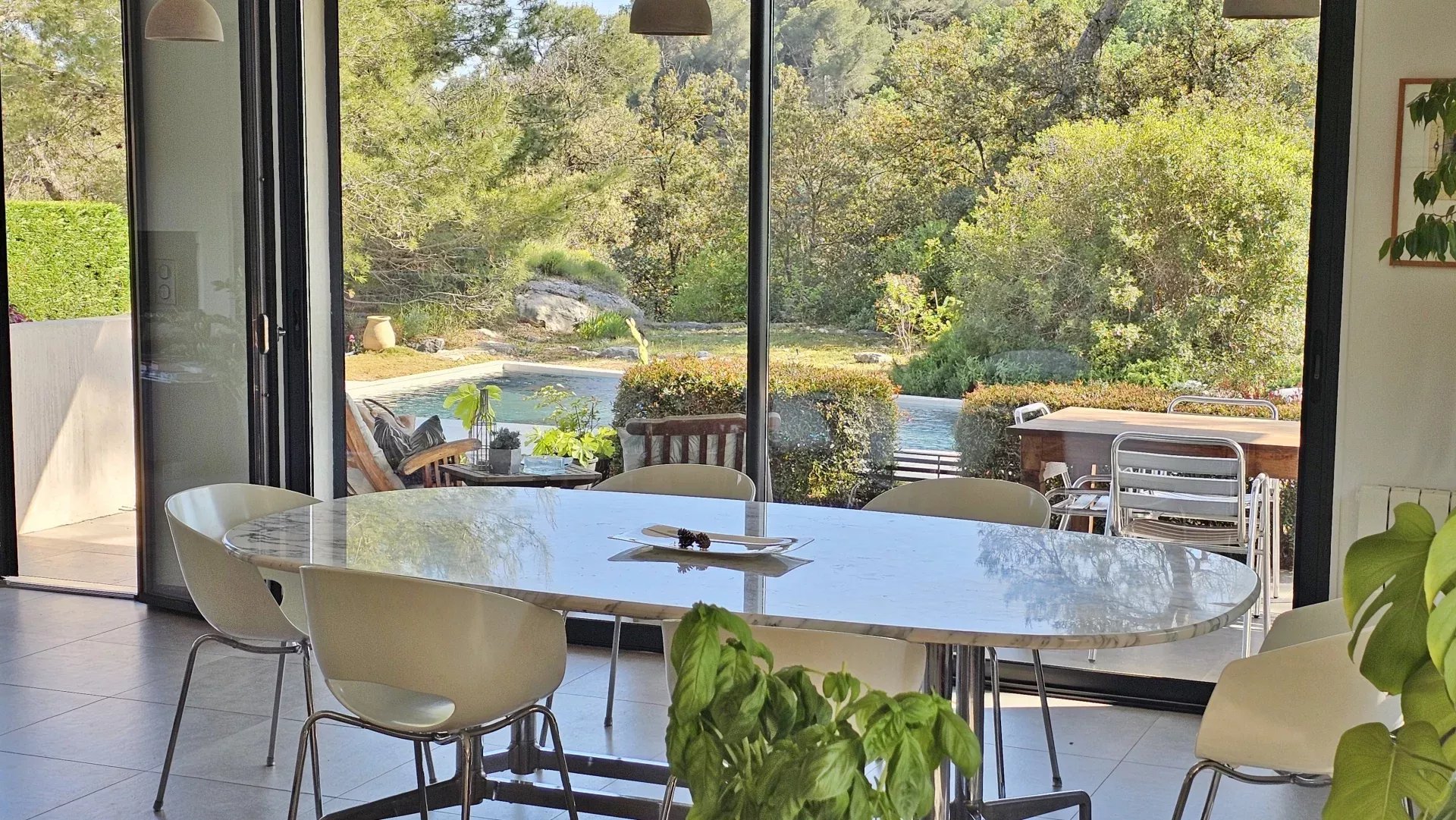 Located in a peaceful and green setting in the South of France, this contemporary villa impresses with its clean lines and exceptional natural light, thanks to large sliding glass doors throughout.