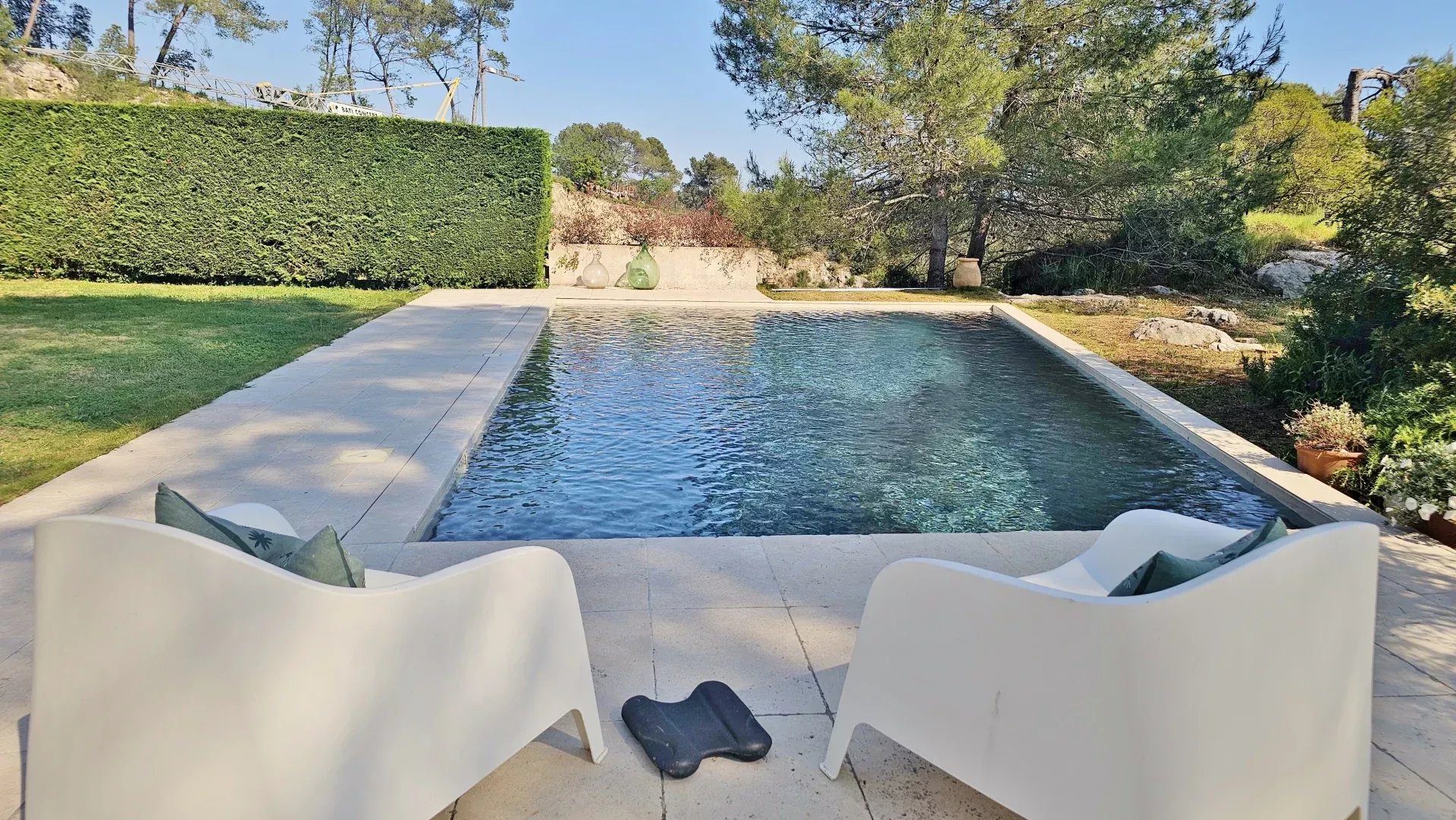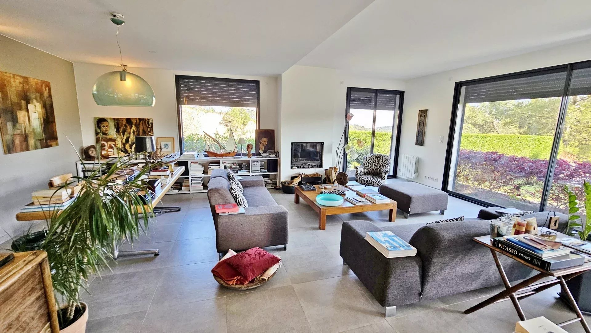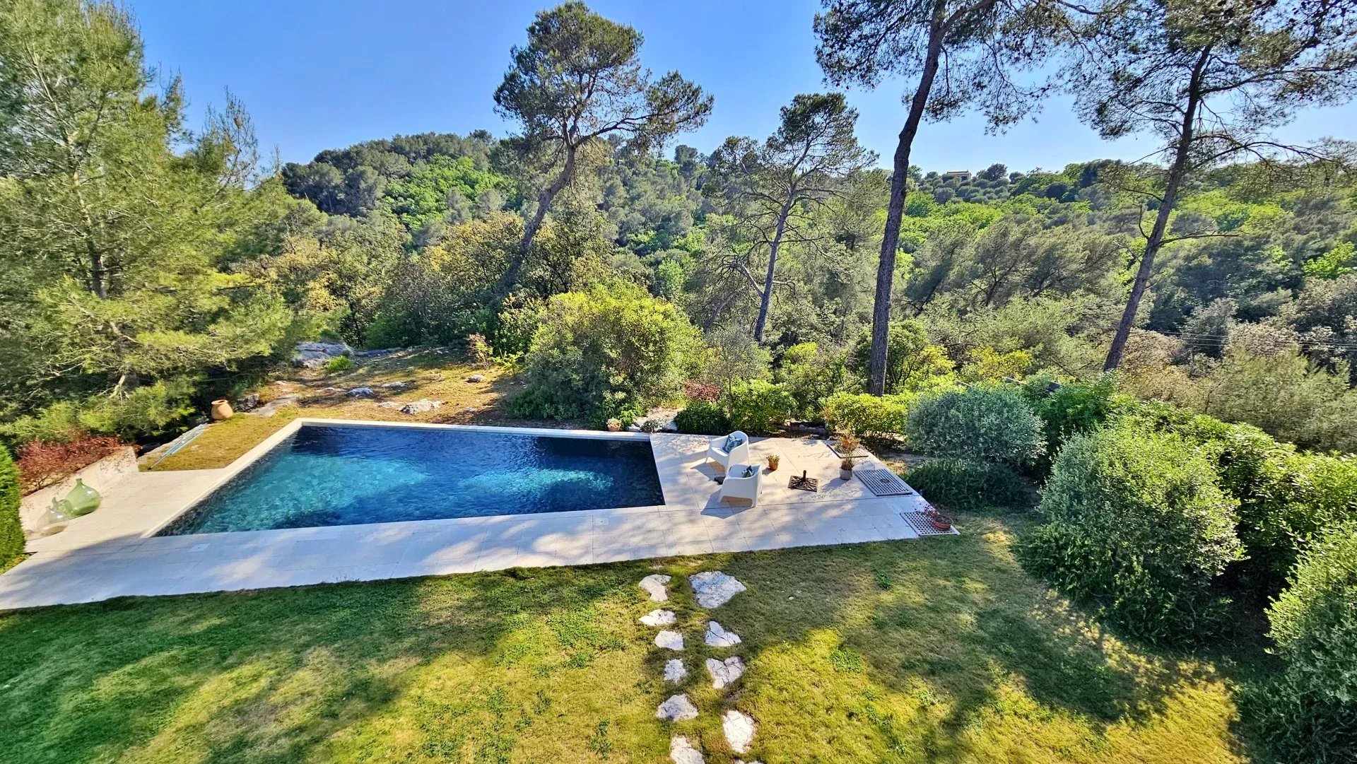 Located in a peaceful and green setting in the South of France, this contemporary villa impresses with its clean lines and exceptional natural light, thanks to large sliding glass doors throughout.