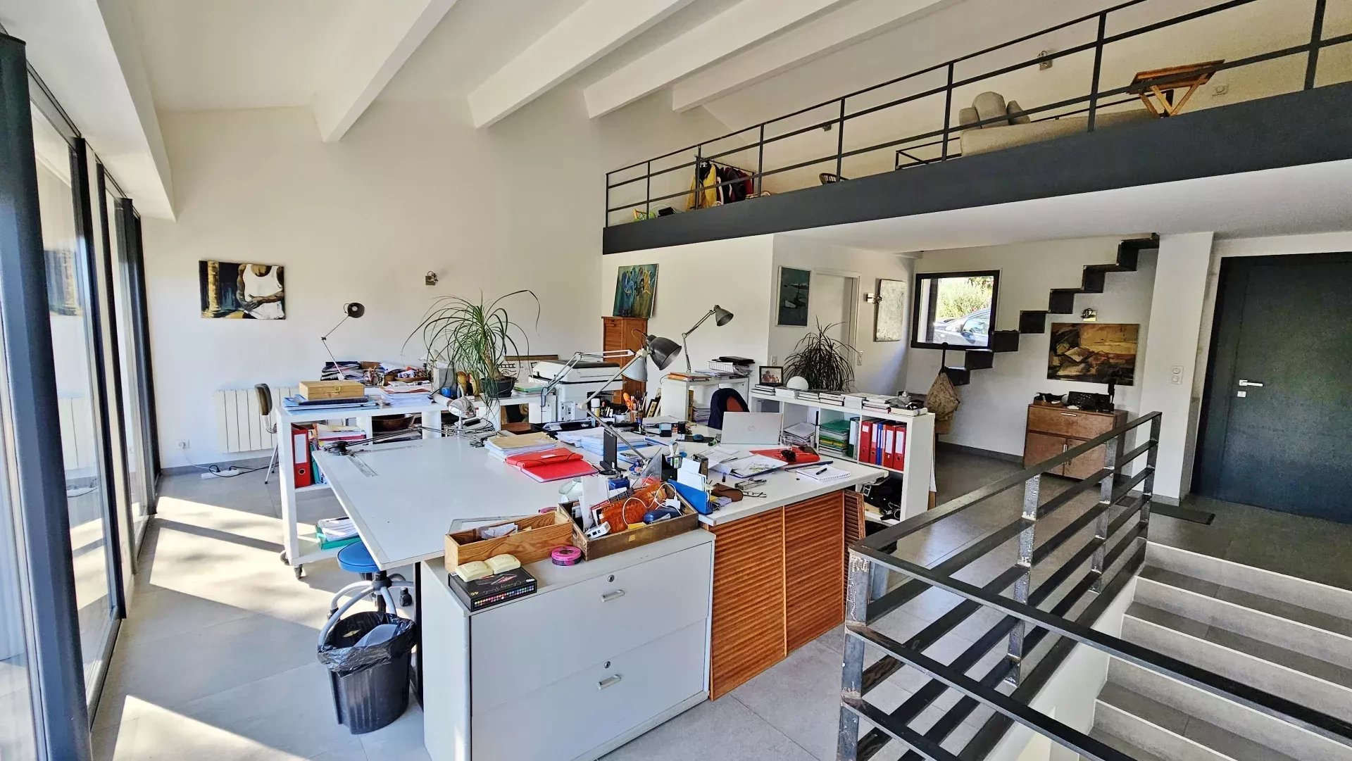 Upstairs, a generous office space offers the potential to be converted into two additional bedrooms. The master suite features its own bathroom with shower and bathtub, and the upper mezzanine level includes another bedroom and bathroom.