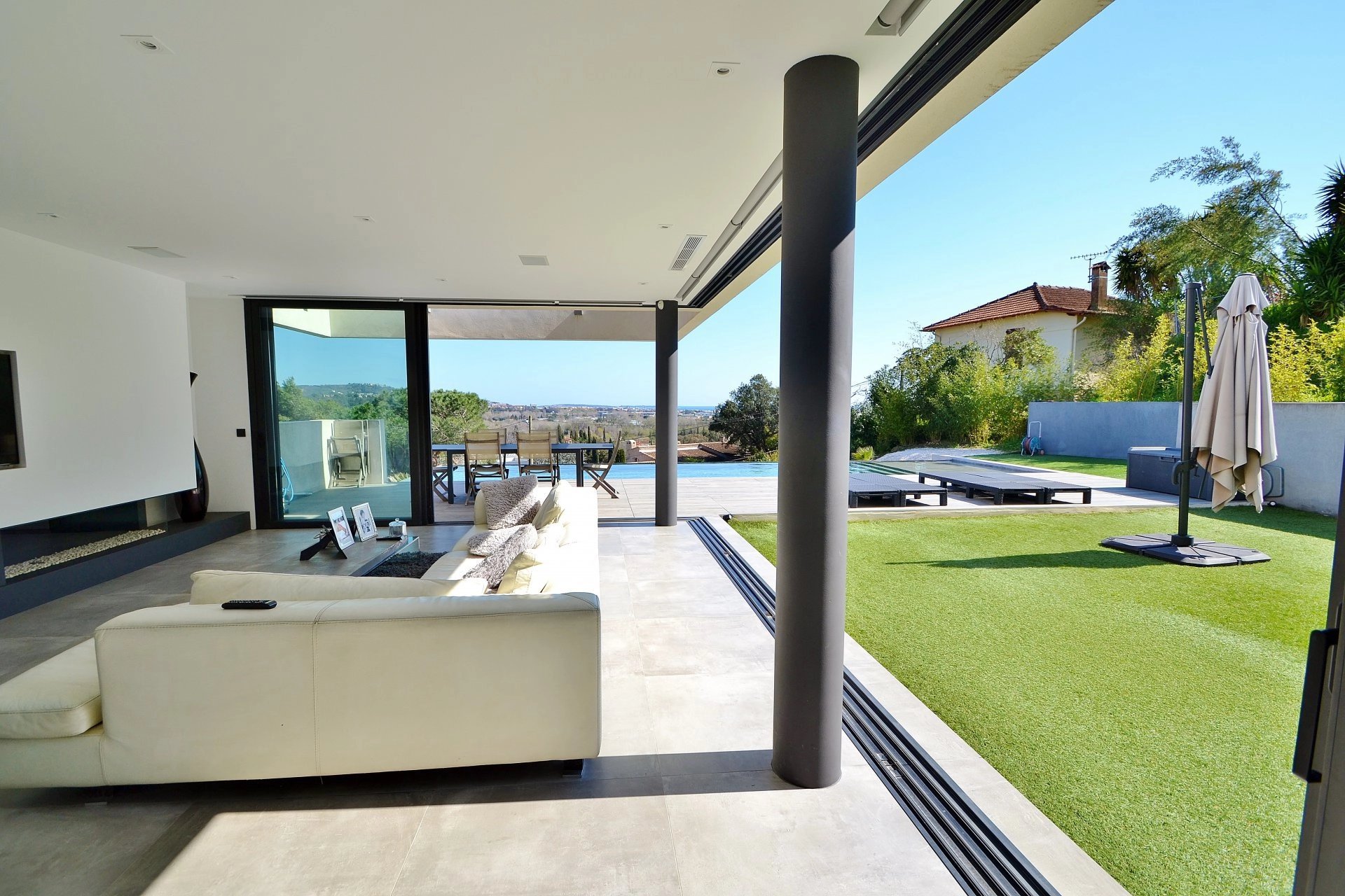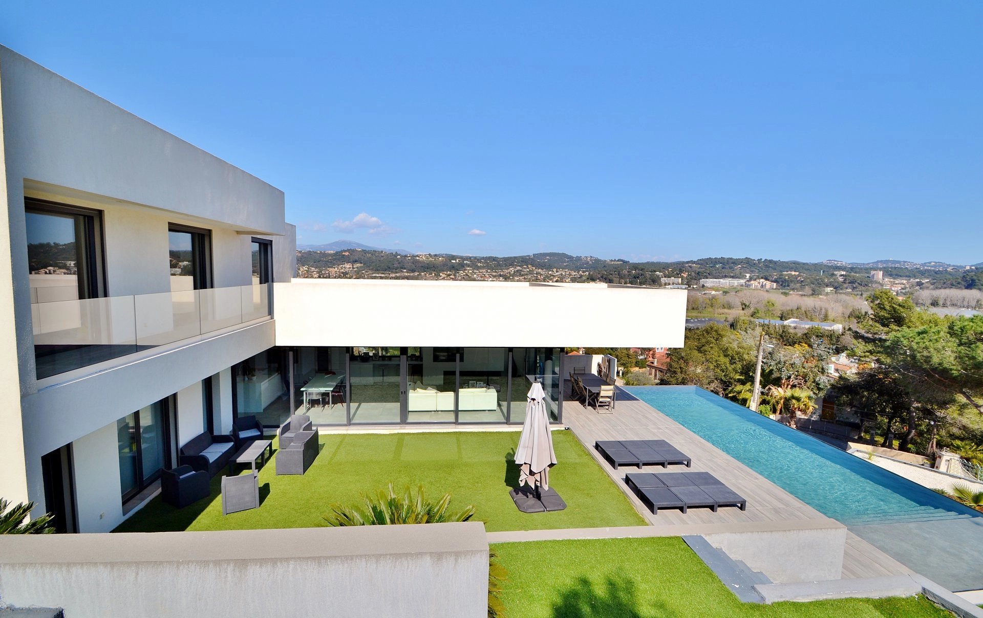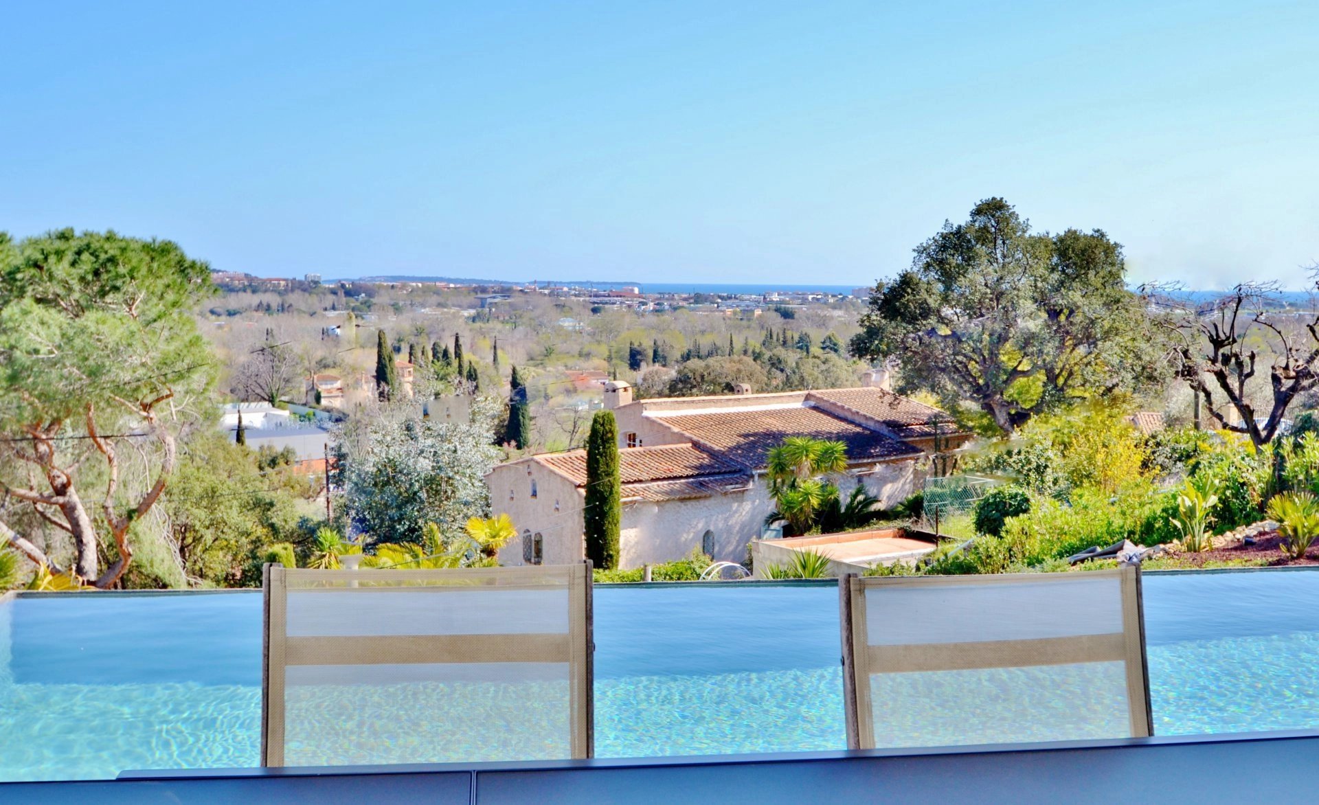 À quelques minutes des accès routiers, au calme sur une belle parcelle de 1500 m² terrain aménagée avec piscine, terrasses et jeu de boules, venez découvrir cette villa contemporaine en excellent état aux prestations de standing. Elle est composée de plain pied : d'une entrée avec rangements, une cuisine équipée ouverte sur le séjour baignée de lumière grâce à ses nombreuses baies vitrées, donnant sur une grande terrasse vue mer et montagnes. Une buanderie, un WC invités et une suite parentale avec dressing et salle de bains de 29 m².