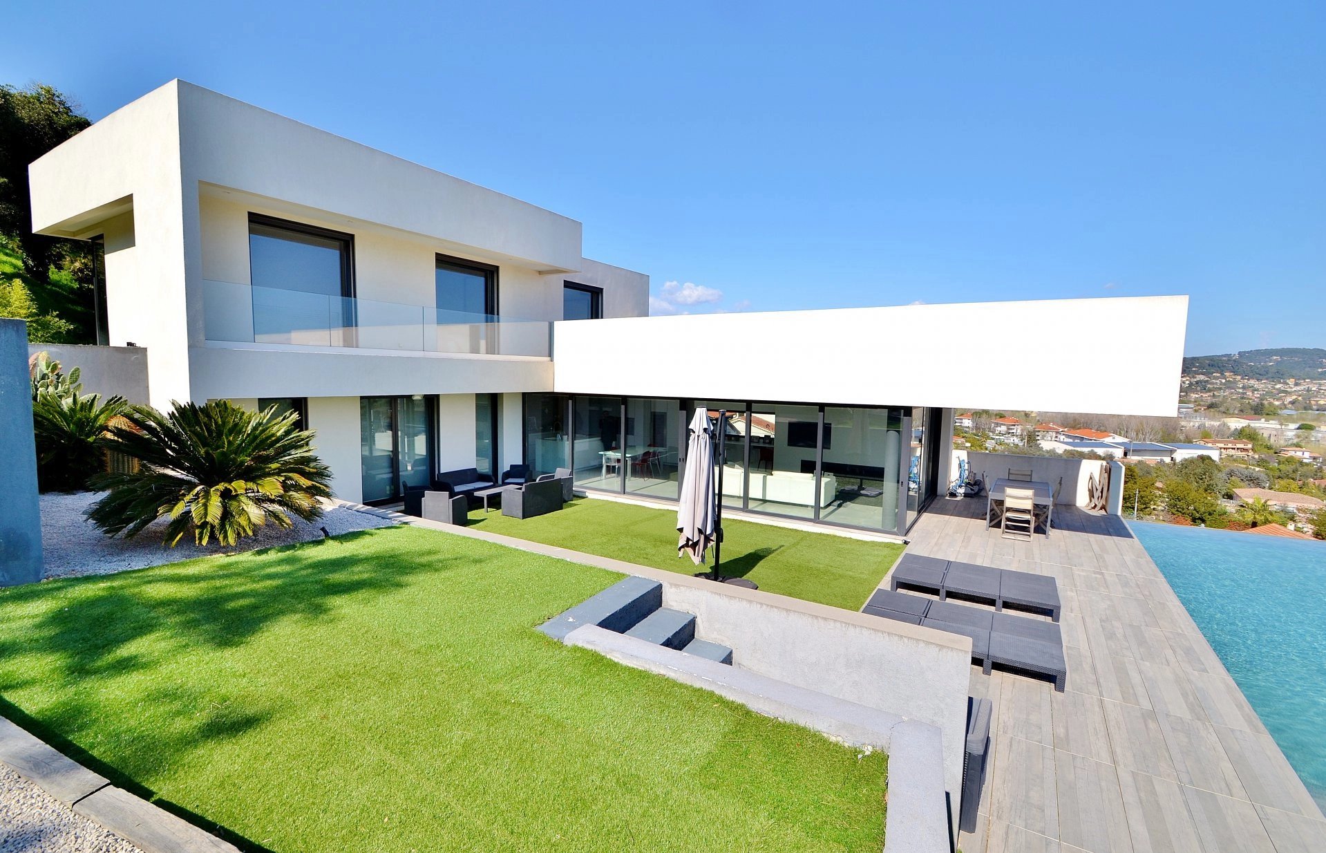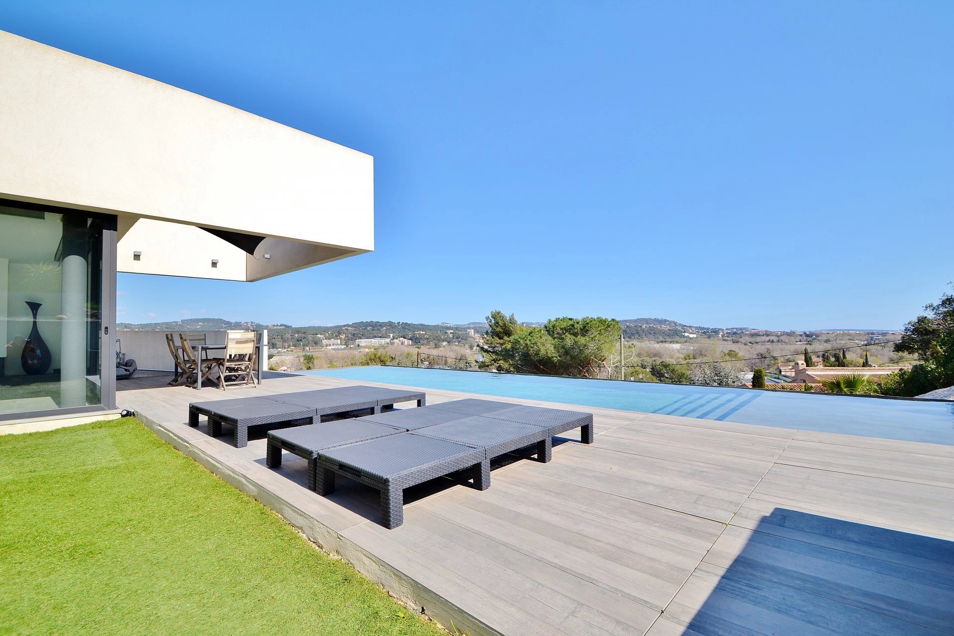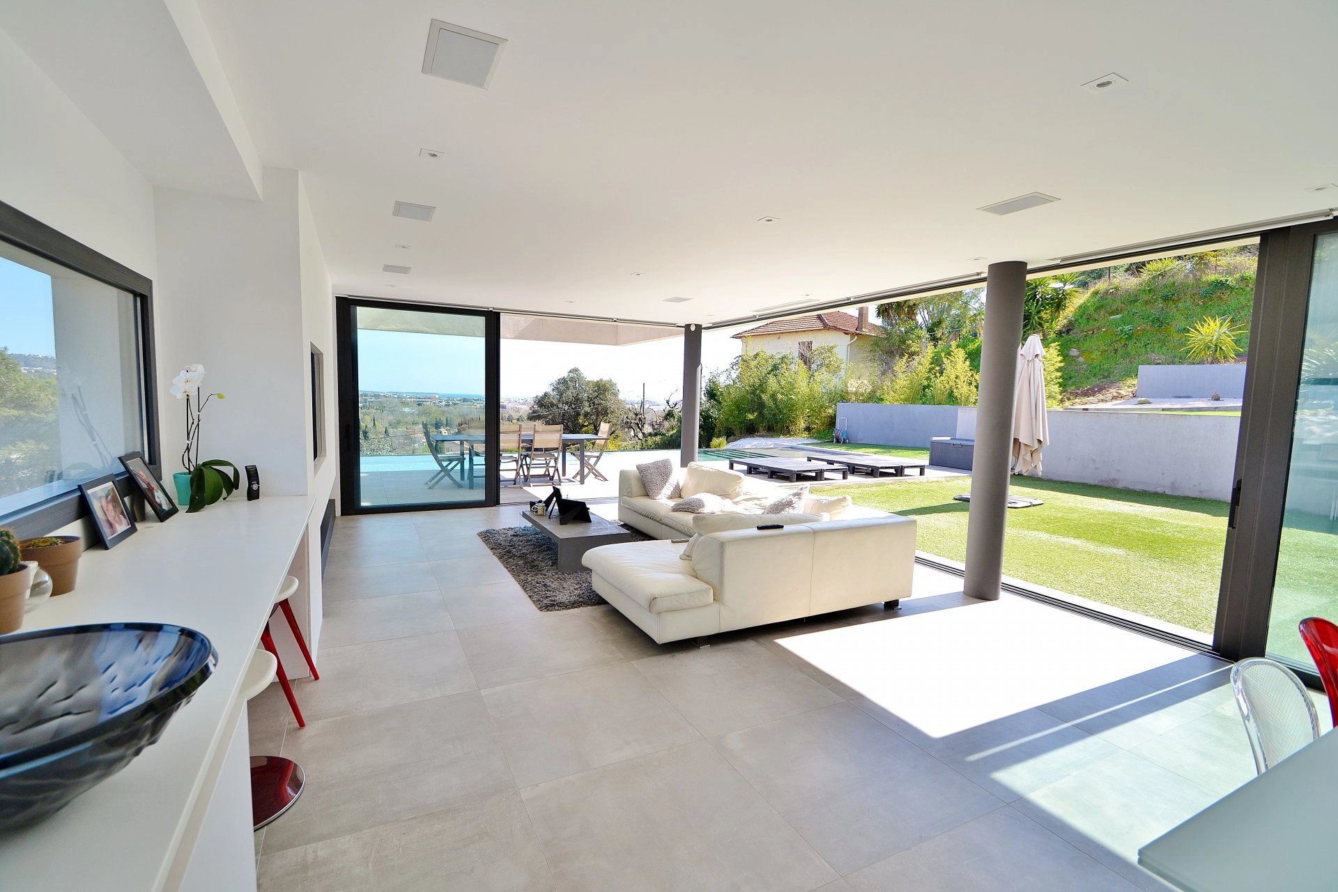 À quelques minutes des accès routiers, au calme sur une belle parcelle de 1500 m² terrain aménagée avec piscine, terrasses et jeu de boules, venez découvrir cette villa contemporaine en excellent état aux prestations de standing. Elle est composée de plain pied : d'une entrée avec rangements, une cuisine équipée ouverte sur le séjour baignée de lumière grâce à ses nombreuses baies vitrées, donnant sur une grande terrasse vue mer et montagnes. Une buanderie, un WC invités et une suite parentale avec dressing et salle de bains de 29 m².