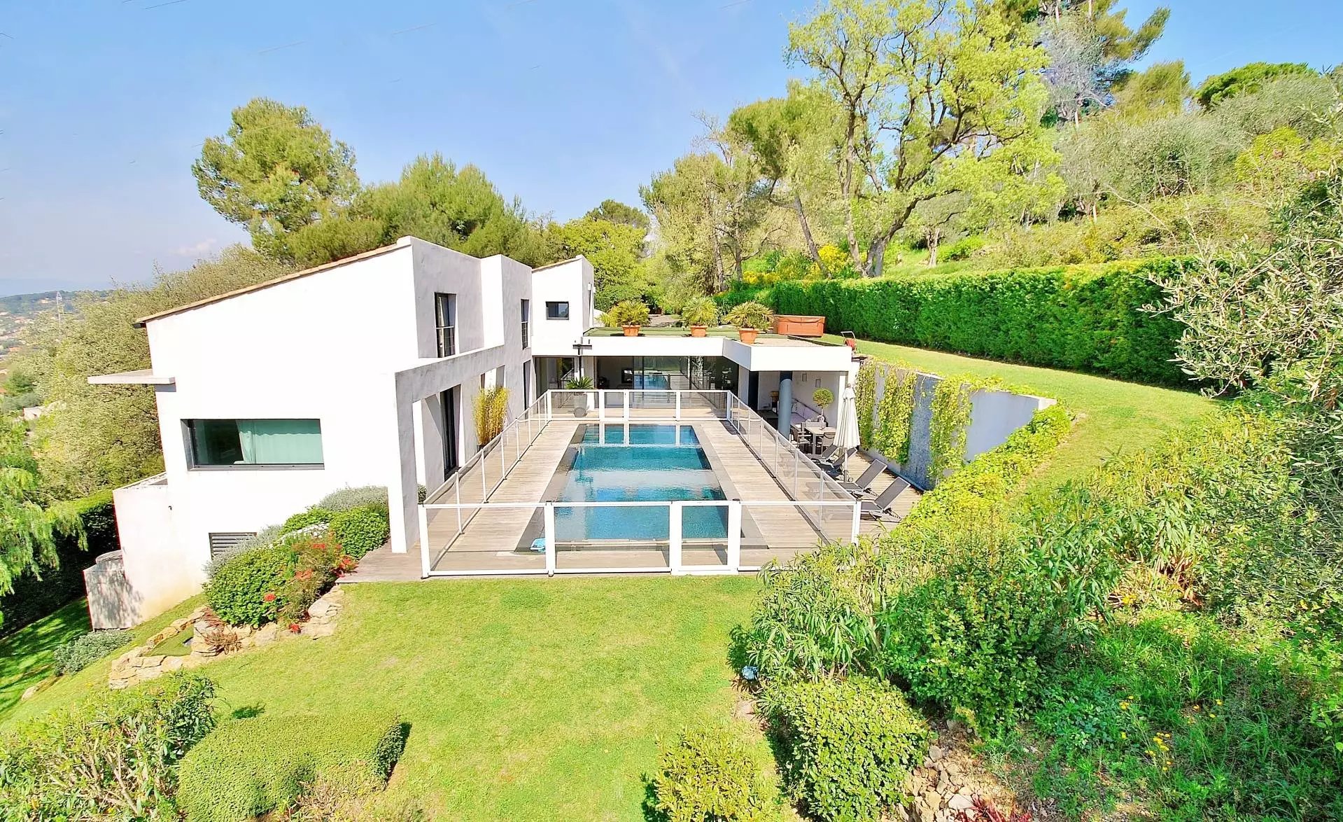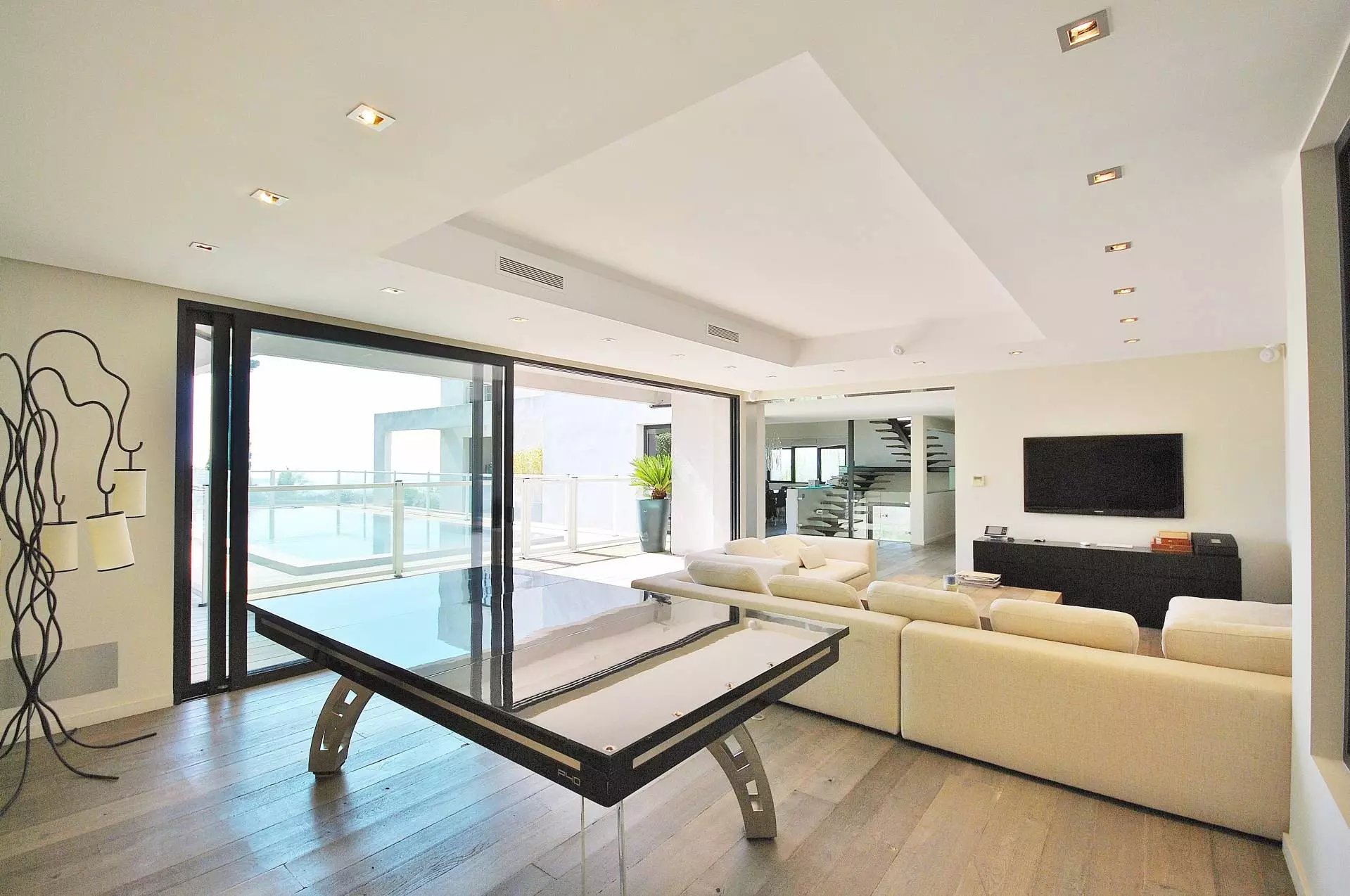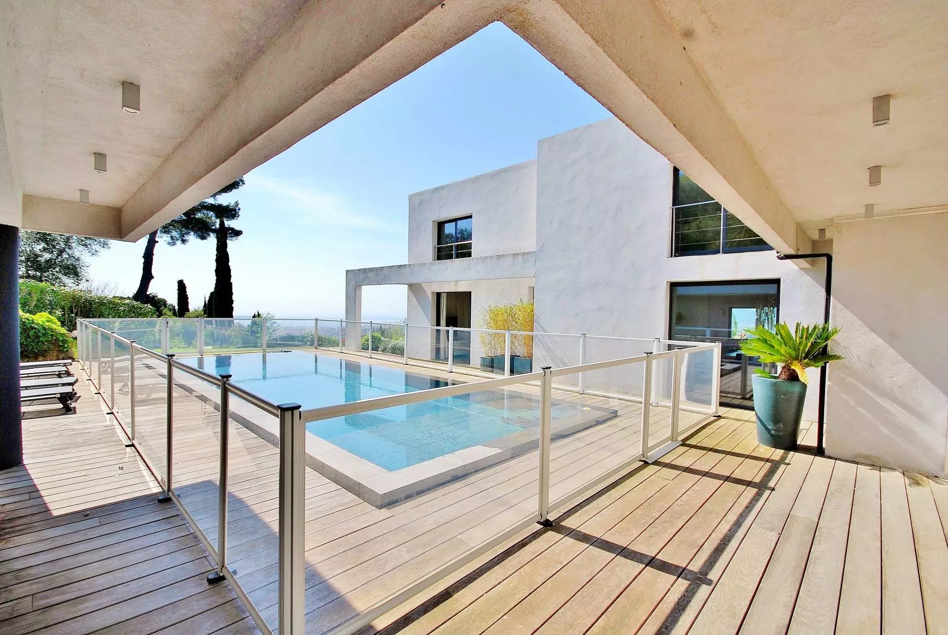 Domaine prestigieux, position dominante avec vue de l'Esterel aux iles de Lerins. Villa contemporaine de 280m² aux prestation modernes et raffinées. Séjour ouvert sur terrasse et piscine, cuisine, salle à manger, chambre de maitre de plain pied avec dressing. Salle de jeu et salle de sport à l'étage. 3 chambres en suite en rez de jardin. Garage. Superbe piscine mirroir. Buanderie, cave, celier.